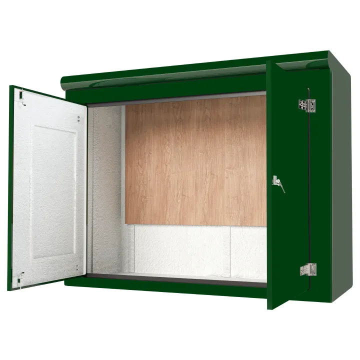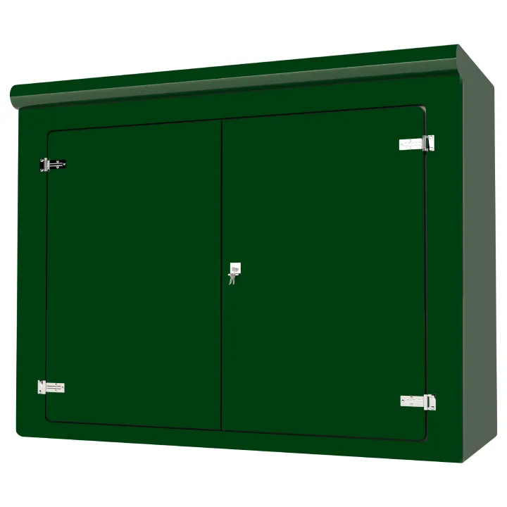 Our VR12 GRP Cabinet is available in Green (BS 14-C-39) and Grey (BS 10-A-05) as standard and is finished internally with a fire-retardant resin, it has a Single Skin Construction and comes complete with stainless steel hinges, security fixings, a cylinder nightlatch lock as well as a surface treated ply backboard, it has an open base c/w an internal fixing down flange for floor mounting. Delivery is normally made by National Carrier.