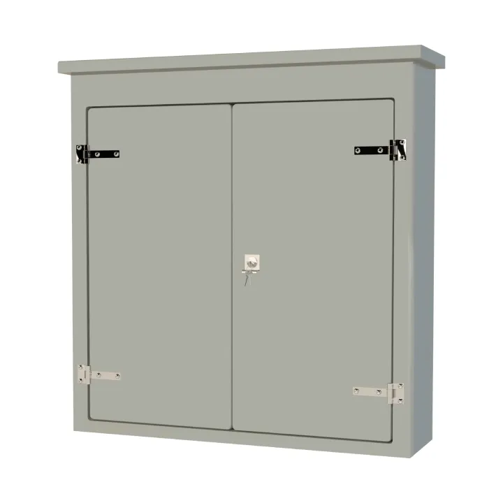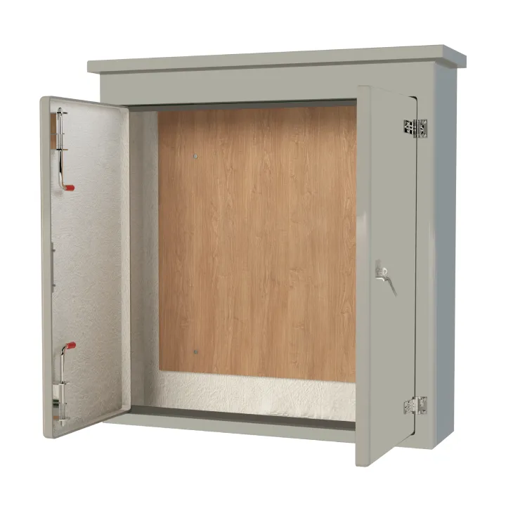 Our VR13-E GRP Enclosure is available in Green (BS 14-C-39) and Grey (BS 10-A-05) as standard and is finished internally with a fire-retardant resin, it has a 12mm ply core encapsulated within the construction and comes complete with stainless steel hinges, security fixings, a cylinder nightlatch lock, hold open door stays and a surface treated ply backboard, it has an open base c/w an internal fixing down flange for floor mounting.