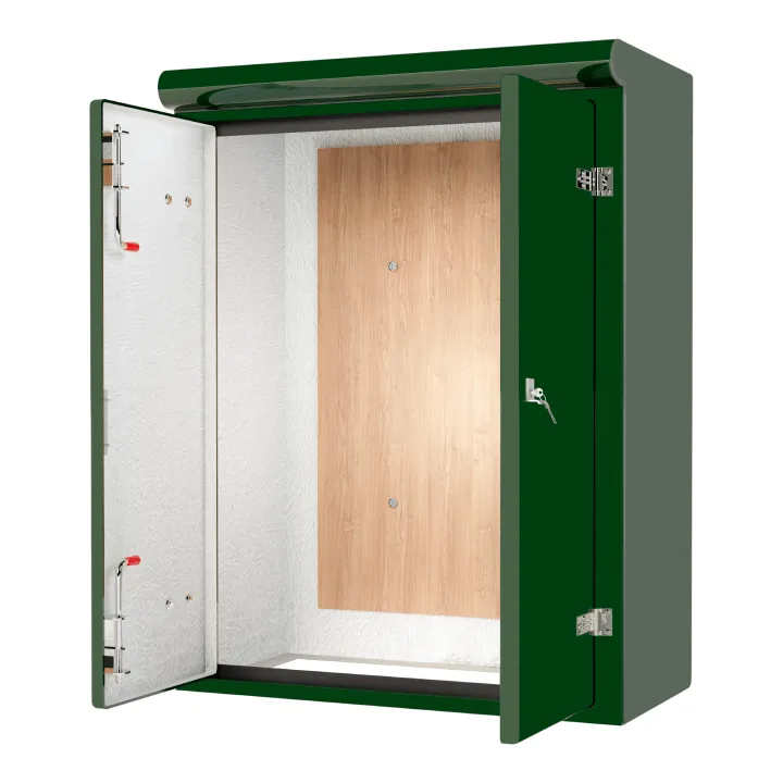 Our VR5 GRP Cabinet is available in Green (BS 14-C-39) and Grey (BS 10-A-05) as standard and is finished internally with a fire-retardant resin, it has a Single Skin Construction and comes complete with stainless steel hinges, security fixings, a cylinder nightlatch lock as well as a surface treated ply backboard, it has an open base c/w an internal fixing down flange for floor mounting. Delivery is normally made by National Carrier.