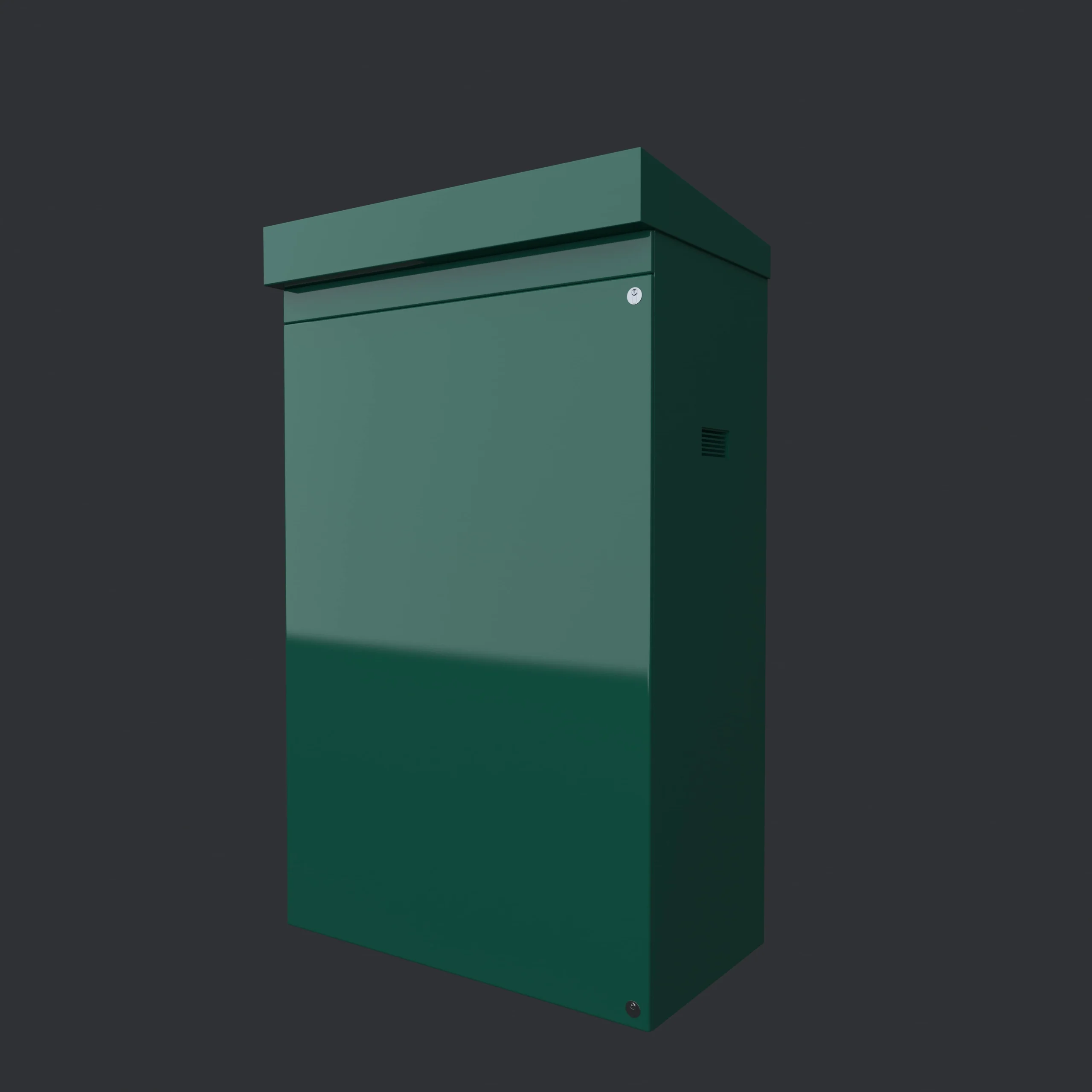 The standard finish is a high quality texture in dark green (RAL 6005). All kiosks are fitted with lifting brackets, 14mm floor fixings, hold open door stays, night-latch lock, 7mm triangular key locks, a surface treated ply backboard and earthing points as standard.